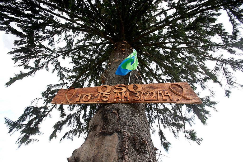 Searchers found a large cedar plank in the mud. They took it to a local mill. Planed and shaped, the fragrant slab was hung on the spruce’s trunk. A carved inscription memorializes the morning the hill fell: “Oso. 10:45 a.m. 3/22/14.”