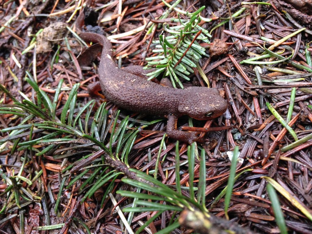 The return trip was delayed twice when Ben discovered rough-skinned newts on the trail. I don’t know how he spotted them, they blended in so well.