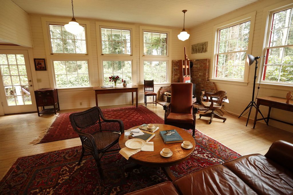 The 73-year-old artist lives nearby and spends much of her time at the schoolhouse, a white building with red accents — the doors the roof, the window frames. It is tucked into the woods off South Camano Road. When sunlight streams through the windows and highlights the wood floor, red rugs and white walls inside, she’ll paint all day long.