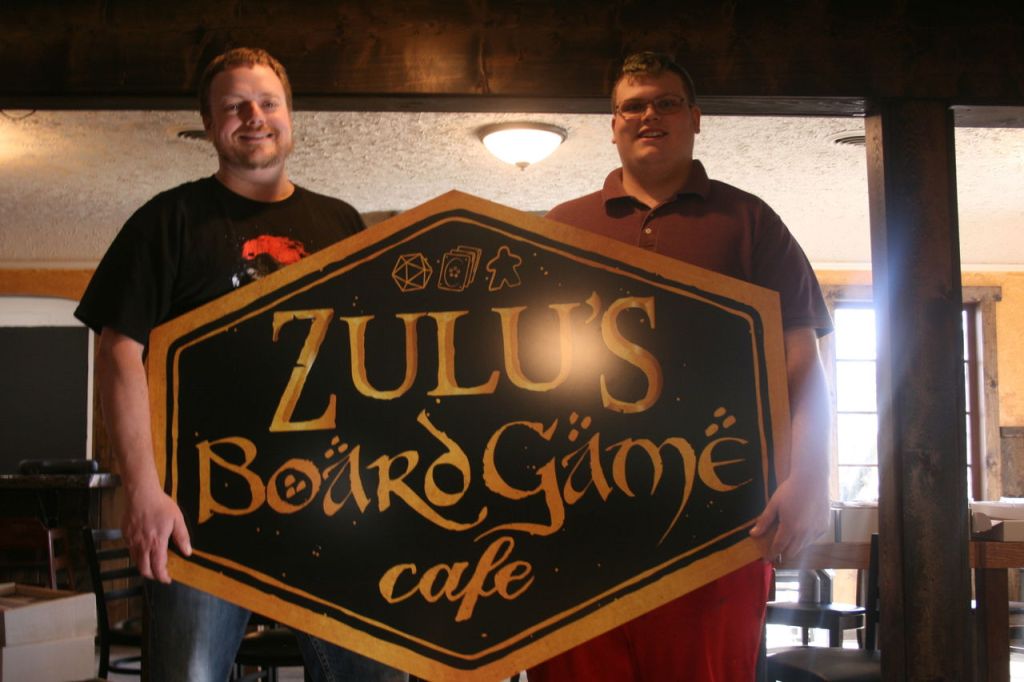 Zulu’s Board Game Cafe owner Matt Zaremba (left) and Kaleb Muse show the sign for the business that’s opening at 10234 Main St. in downtown Bothell.