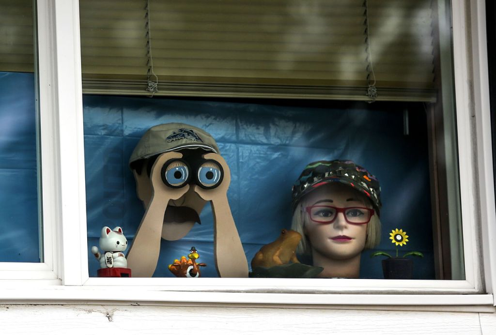 She’s not the only one keeping watch. There are two faces peering out the front window.