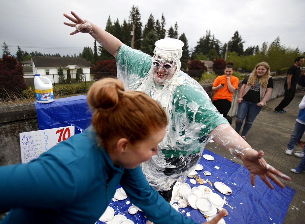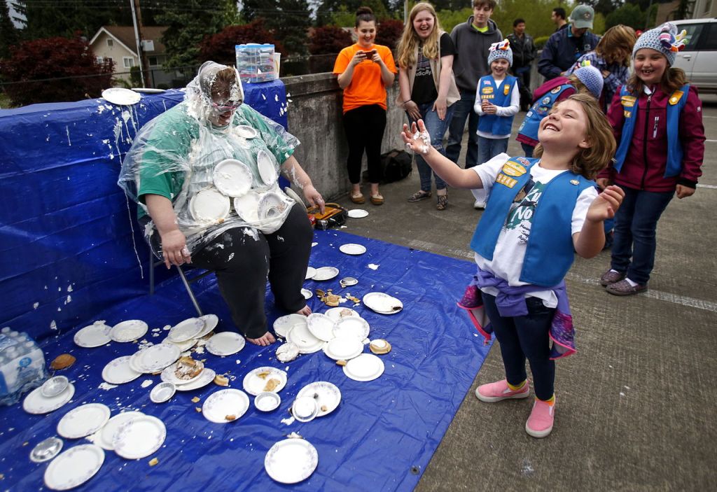 This is far from Fish’s first time as a Girl Scout leader. She filled that role when her daughters, Cassidy and Chandler, were younger. Last summer, Chandler Fish was featured in The Herald when she was headed to Washington State University with a guide dog in training. Tina Fish remains involved in that cause, and is raising a Labrador retriever named Jane for the nonprofit Guide Dogs for the Blind. The Daisies have gotten to know Jane, and the dog was there to see her master plastered with pies.