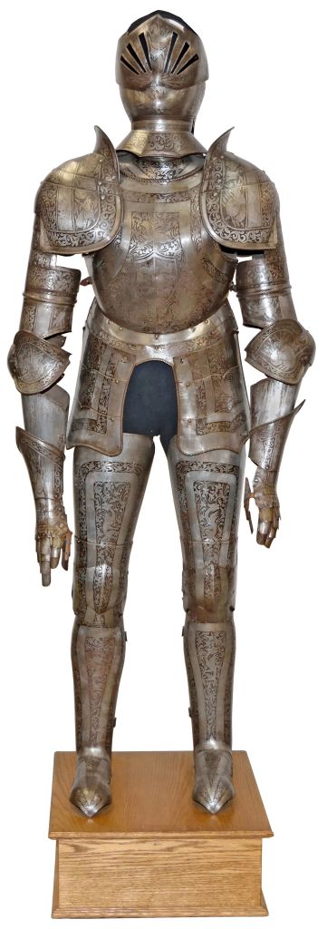 Authentic armor is very rare and expensive today, but occasionally an auction offers a reproduction of a suit of armor. Poulin Antiques and Auctions of Fairfield, Maine, sold a 69-inch high set with overall etching in March 2016. It was probably made in the late 1800s or early 1900s. Estimated at $1,400 to $1,800, it sold for $2,115.