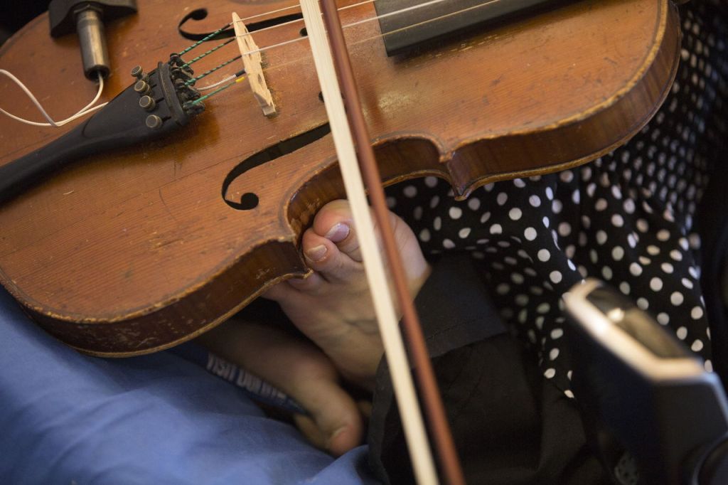 She holds her instrument in front of her like a cello instead of under her neck. She also uses a half-sized bass bow instead of a typical violin bow. For the most part, though, she downplays the physical challenges of playing.