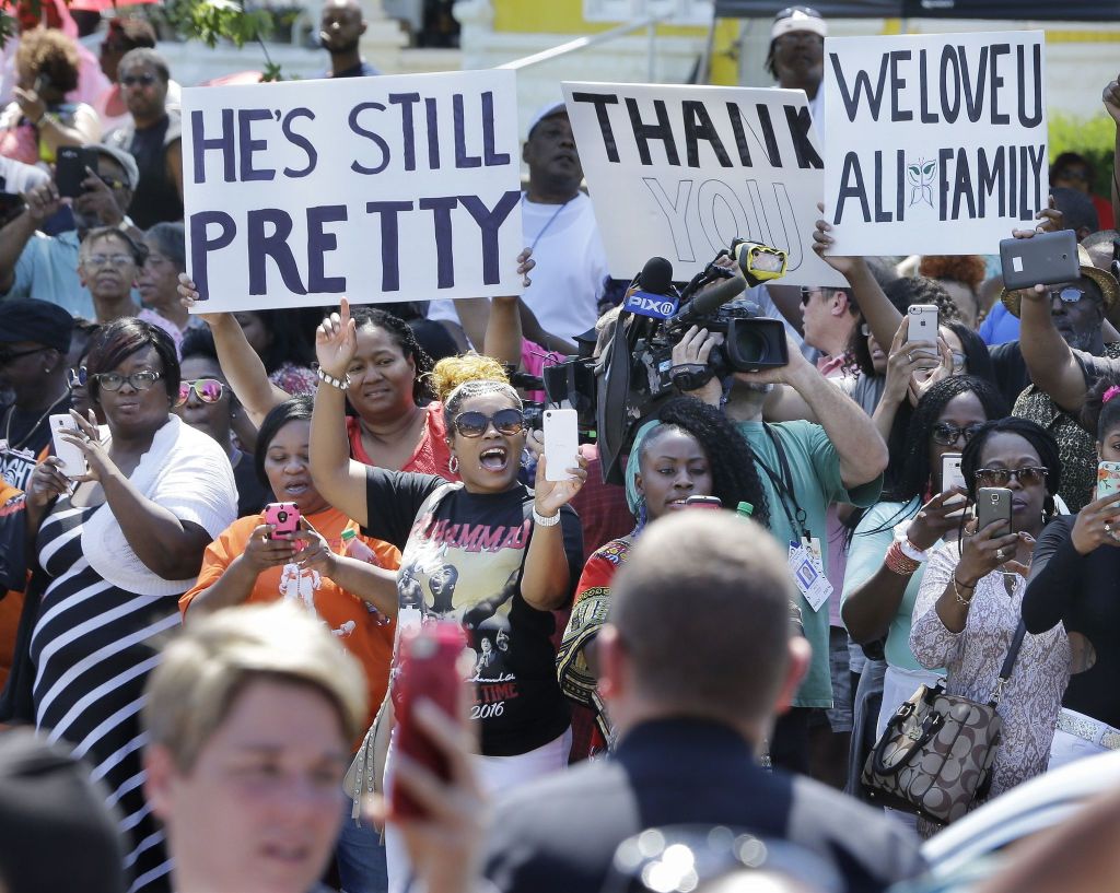 People gathered early in the day outside Ali’s boyhood home, which was decorated with balloons, flags, flowers and posters. Fans took photos of themselves in front of the house. Some people staked out their places nearby with lawn chairs.