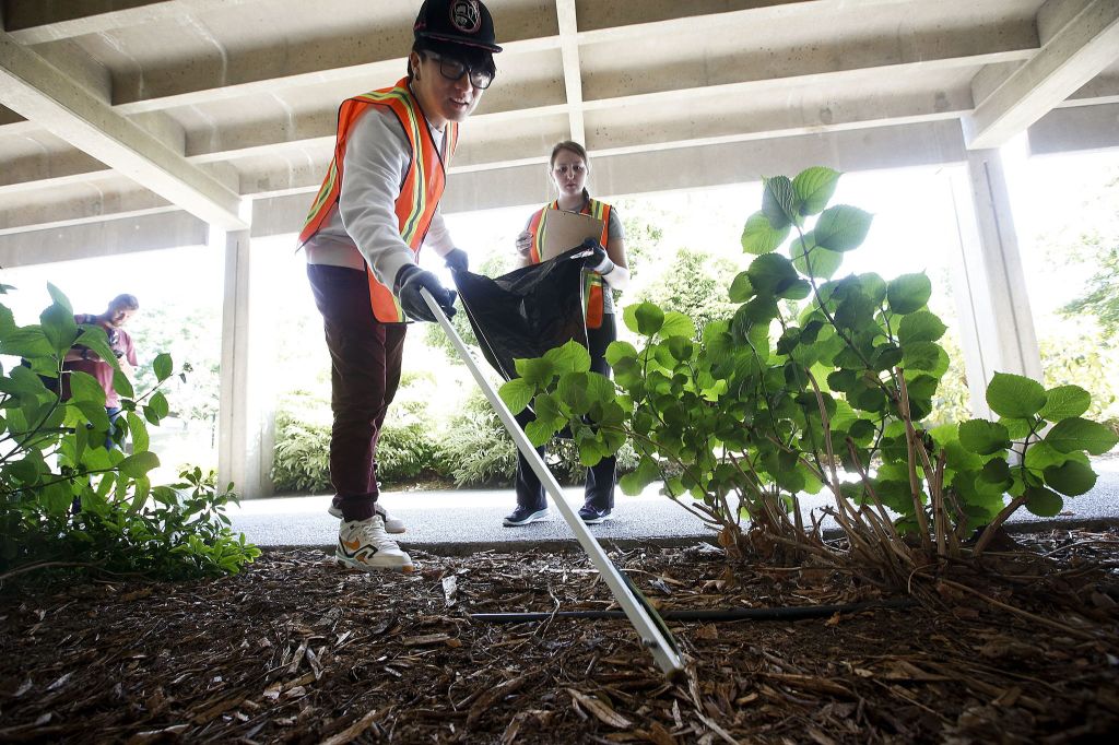 Edmonds Community College student Yifan Zhang picks up pieces of trash while Kaitlyn Sells tallies the number of each type of garbage found during "Trashy Tuesdays," a weekly volunteer event, at the school on May 31.