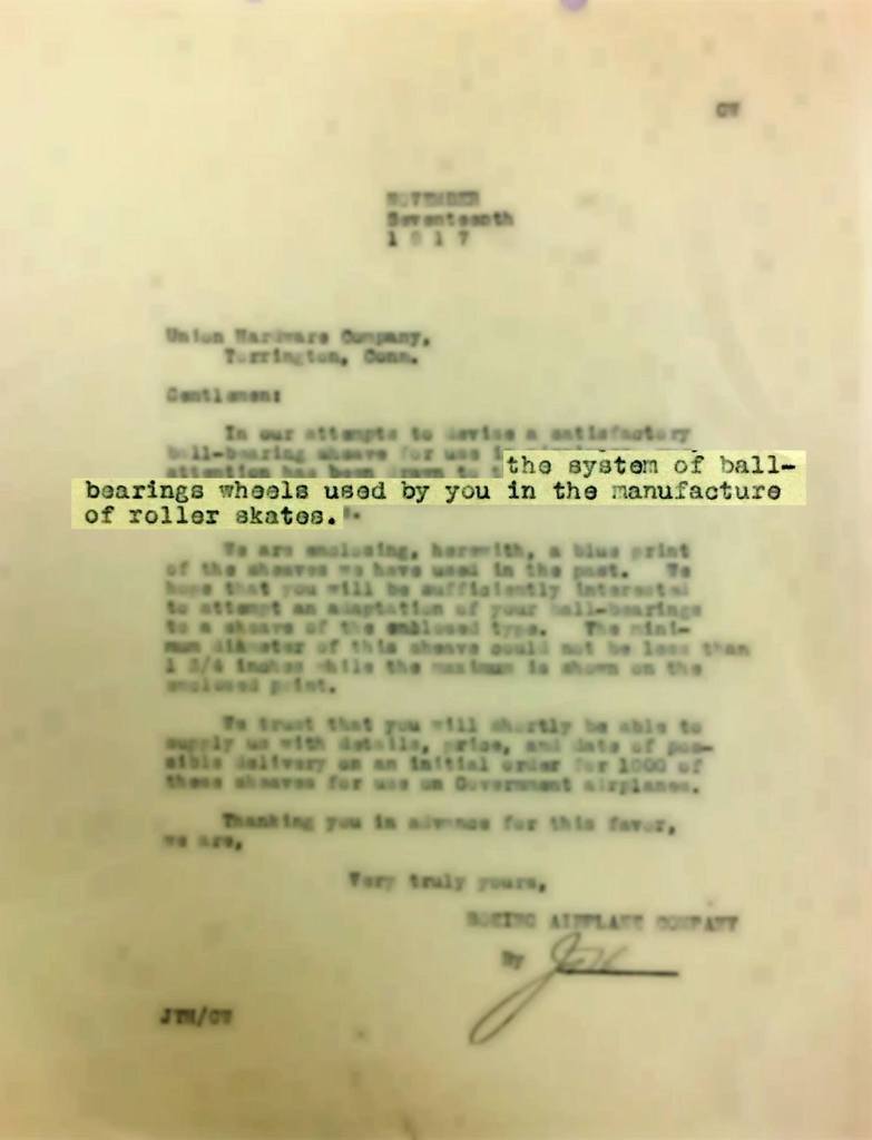 In 1917, a roller-skate maker knew more about ball bearings than the Boeing Airplane Co.