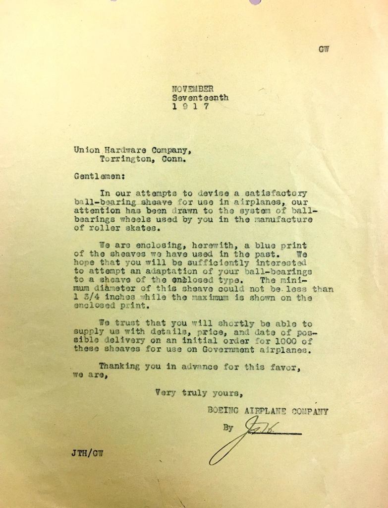 Boeing asked Union Hardware for a quote on 1,000 ball bearing sheaves “for use on government airplanes.” While it doesn’t specify which plane, the letter is almost certainly talking about Boeing’s Model C seaplane trainer. The U.S. Navy wanted to buy 50 of the airplanes — the company’s first big order.