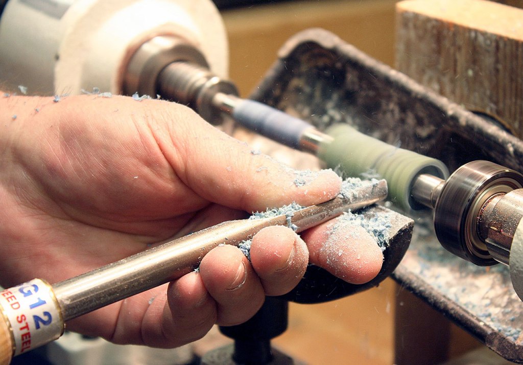 Then he mounts the piece to the lathe’s rotating drive, shaping and sanding the chunky shell until it resembles a writing utensil.