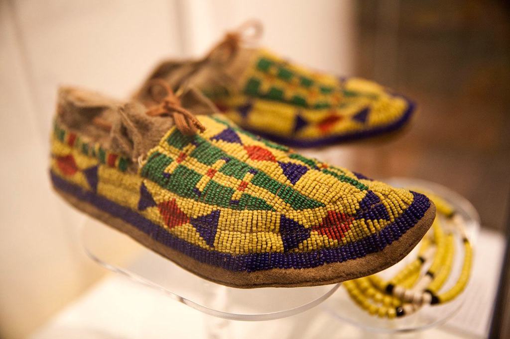 View and read about these items, which include beads of all sorts, beaded moccasins, cuffs and bags, carvings of miniature paddles, racing canoes and story poles, a model stick game, woven baskets, sharpening stones, a bark shredder, arrows, candle holders, ribbons, headbands, jewelry, and a knitted vest and gaiters.