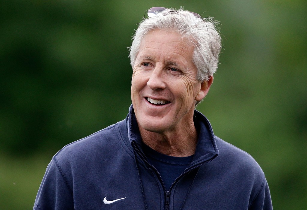 Seattle Seahawks head coach Pete Carroll smiles at an NFL football practice Thursday in Renton. (AP Photo/Elaine Thompson)