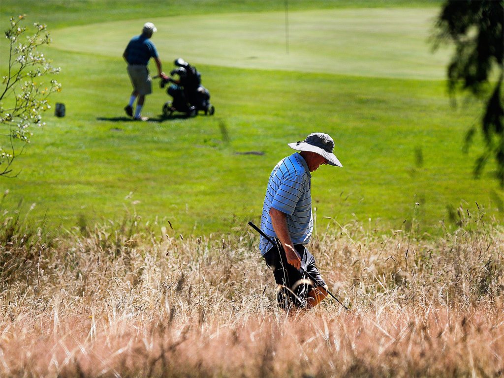 A nasty bit of rough at the Kenwanda Golf Course in Snohomish offers a golfer the opportunity to spend more time in the hot sun while looking for his ball Monday. Although he did seem to possess a sense of humor—and for sure an excellent sun hat—he was not amused enough to reveal his name.