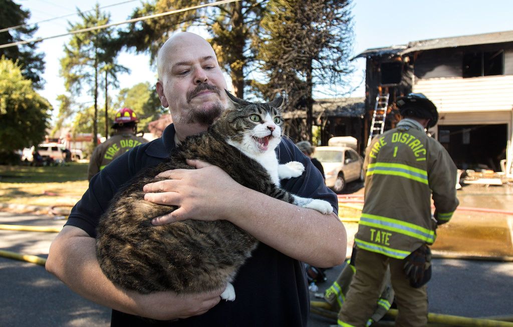Romeo pants heavily in the arms of his owner Erron Whitten after being found after a fire along 107th Street SW in Everett on Thursday. The duplex was destroyed, and one of Whitten’s two cats remain missing. ( Andy Bronson / The Herald )