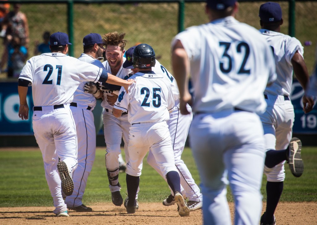 The Everett AquaSox rush the field to congratulate Eric Filia after his walkoff two-run single gave Everett a 6-5 come-from-behind win over the Vancouver Canadians on Wednesday before 4,379 fans on Kidճ Day at Everett Memorial Stadium. (Daniella Beccaria / For the Herald)