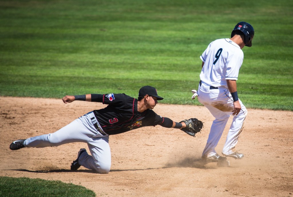 AquaSox Bryson Brigman scoops up a bouncing ball and makes the throw to first base as the Everett AquaSox beat the Vancouver Canadians 6-5 in the bottom of the ninth inning at Everett Memorial Stadium on Wednesday, July 27, 2016 in Everett, Wa. ( Andy Bronson / The Herald )