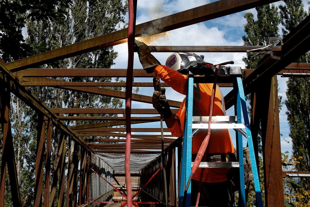 Corona Steel ironworker Abraham Rodriquez welds a brace in place on the pedestrian bridge at Howarth Park in Everett on Monday. The bridge and beach access have been closed since May 2015, when an inspection uncovered deterioration on the bridge’s steel beams that support its walking surface. Repairs to the bridge are expected to be finished in September. (Andy Bronson / The Herald )