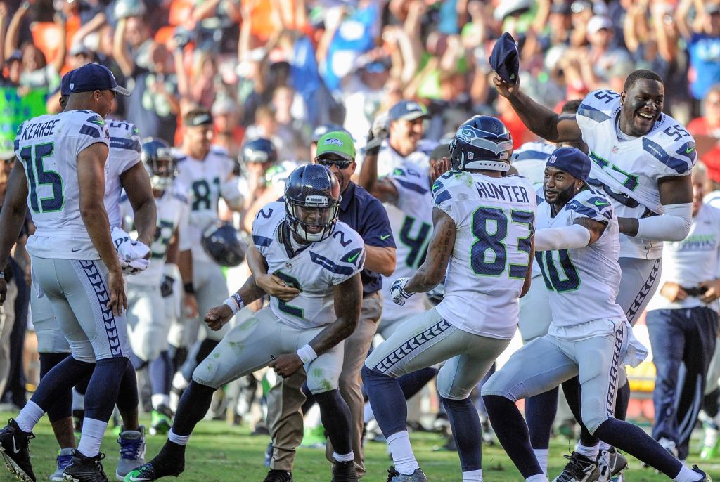 The Seahawks, including backup quarterback Trevone Boykin (2) and defensive end Frank Clark (55), celebrate after running back Troymaine Pope scored on a two-point conversion with no time left in the second half to lift Seattle to a 17-16 victory over the Kansas City Chiefs in a preseason game. (AP Photo/Ed Zurga)
