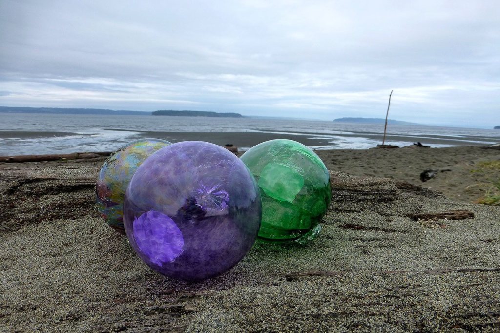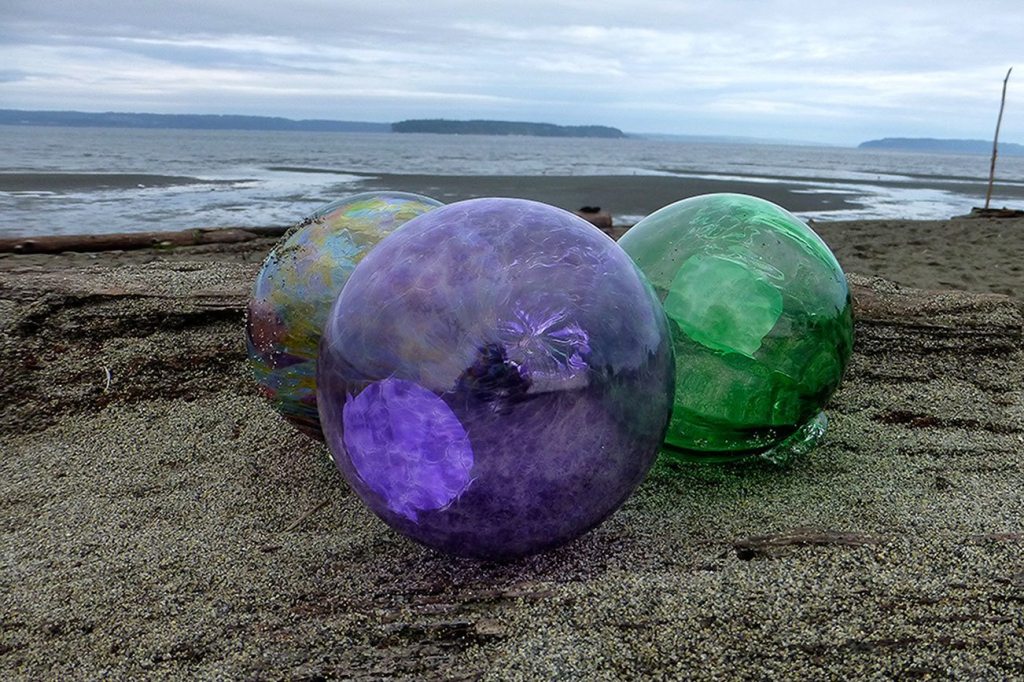 The glass balls, patterned after the Japanese fish net floats one used to be able to find on Pacific coast beaches, are colorful and valuable.