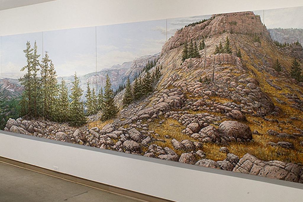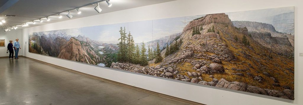 The Heald piece is 16 panels joined together to represent, from left to right, the rainy west side of the Rocky Mountains, the snowy peaks of the north, the view to the plains in the east and the red rocks of the south. He painted four at a time, using the fourth of the previous set as a guide for the next set of four.