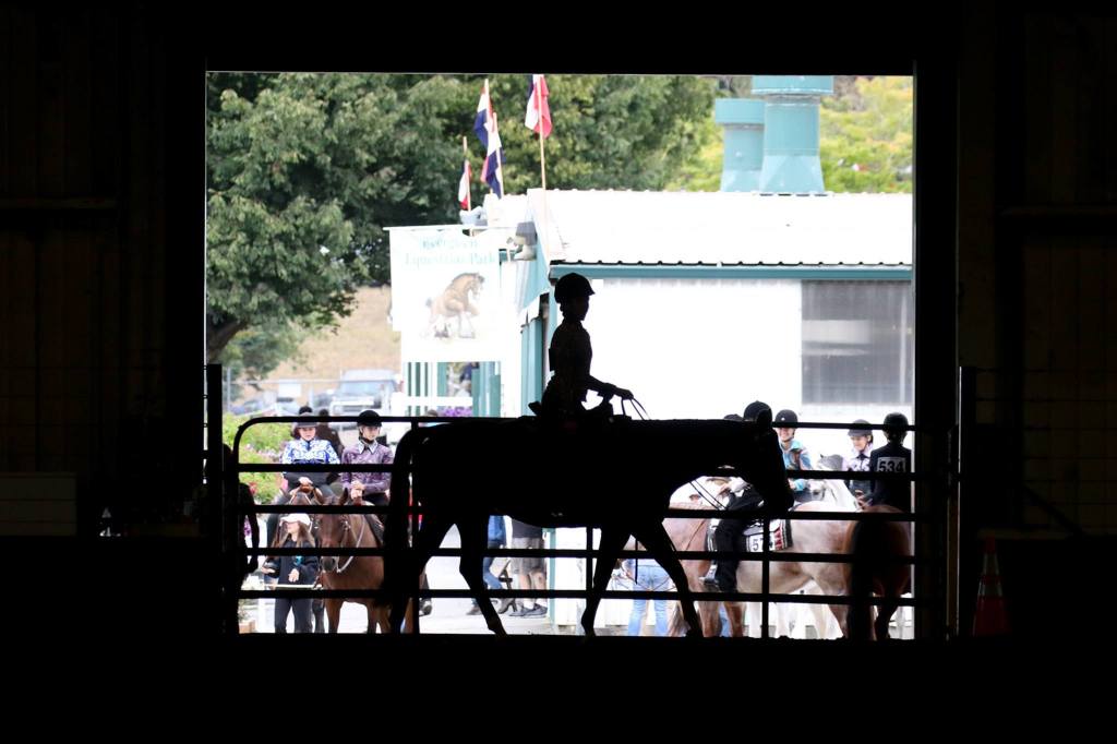 A contestant rides in the Novice English Pleasure competition Saturday afternoon at the Evergreen State Fair in Monroe. (Kevin Clark / The Herald)