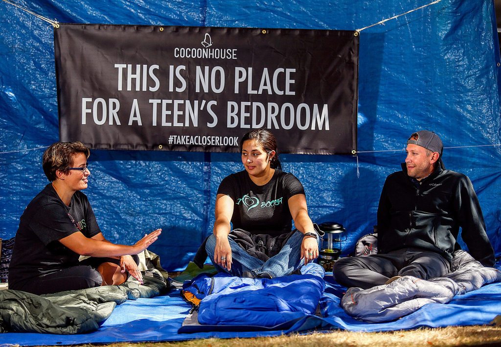 They camped outside the Cocoon House headquarters on Everett’s Pine Street. The event was staged to raise awareness of teen homelessness and to bring in donations to the agency, which was founded in 1990 by Sarri Gilman.