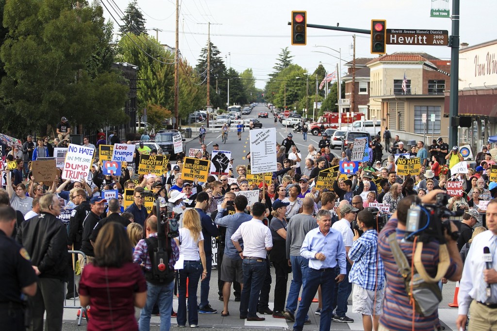 At least two protesters were arrested, one for misdemeanor assault and the other for disorderly conduct, Everett police officer Aaron Snell said. Both were booked into the Snohomish County Jail.