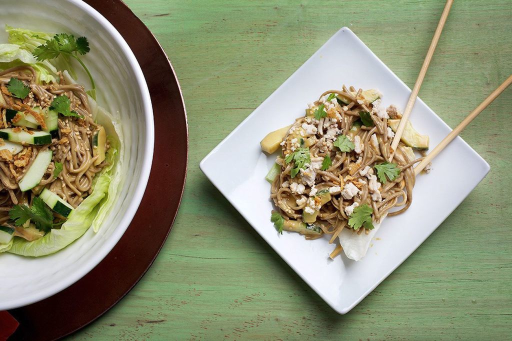 Whether you serve it at room temperature or chilled, this dish offers a nice blend of mild crunch, nutty-tasting noodles and a quick no-cook dressing.