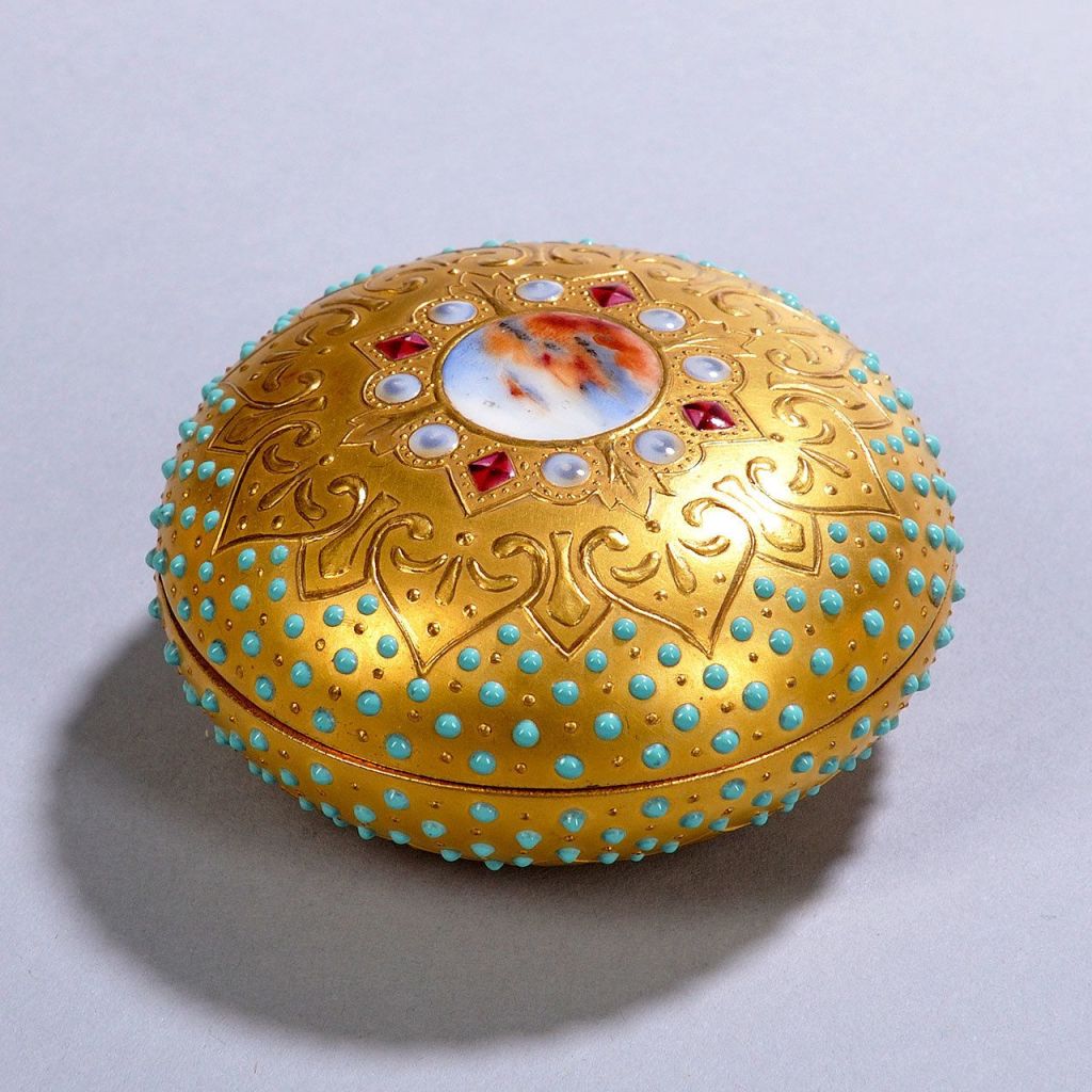In 1895, Coalport was able to make the jeweled porcelains by a less expensive method, and more pieces were sold. Collectors have favored these pieces since the 1950s and prices are high today. At a 2016 Skinner auction in Boston, which included over 60 pieces of this type of Coalport, a round covered box, just 2 1/2 inches in diameter, brought $461. The box has turquoise beading and a central medallion. A two-handled shaped bowl with a cover sold for about $1,000 at the same sale.