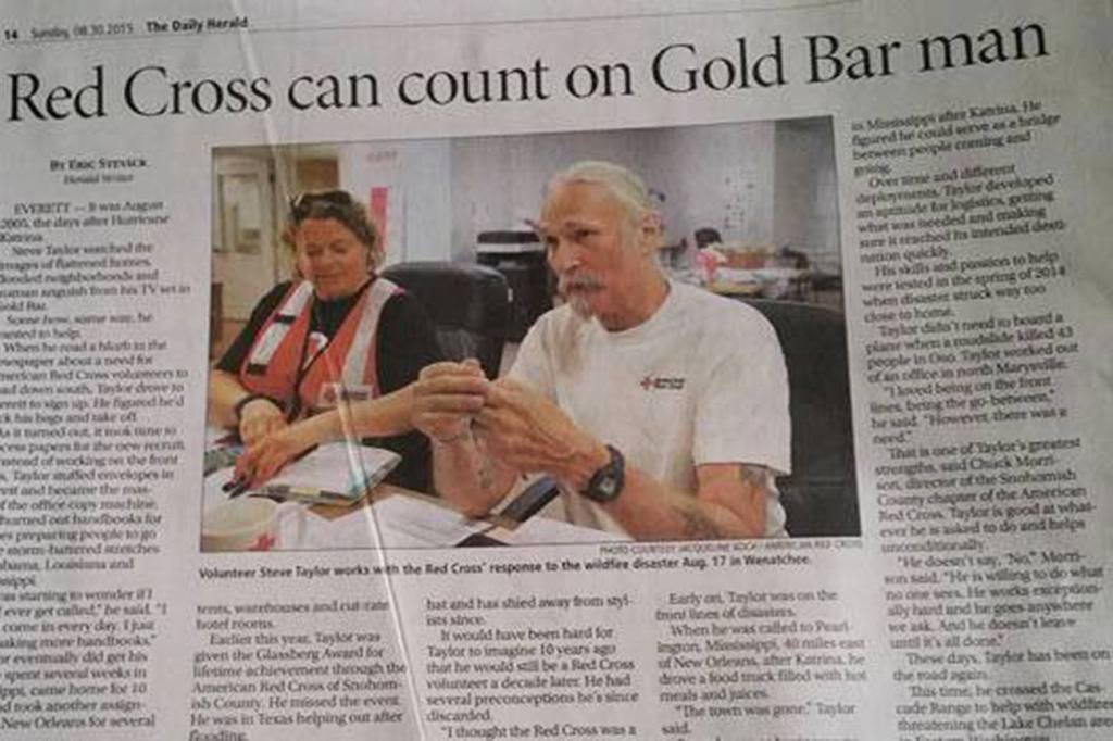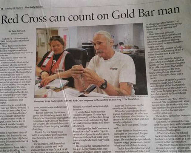 “Recently, he’s taken some time off,” said Chuck Morrison, director of the Snohomish County chapter of the Red Cross. “You might think that was to take a rest, but it’s been to care for two ailing neighbors. Steve simply enjoys helping people when they need help. His Red Cross friends locally and across the country look at this as our opportunity to offer Steve our help.”