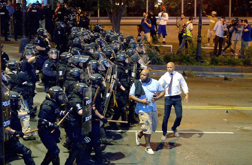 Charlotte-Mecklenburg police officers push protesters from an intersection near the Epicentre in Charlotte, North Carolina, on Wednesday. Authorities tried to quell public anger Wednesday after a police officer shot a black man, but a dusk prayer vigil turned into a second night of violence, with police firing tear gas at angry protesters and a man being critically wounded by gunfire. North Carolina’s governor declared a state of emergency in the city. (Jeff Siner/The Charlotte Observer via AP)