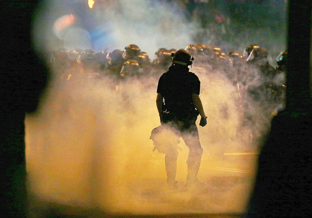 Police fire teargas as protestors converge on downtown following Tuesday’s police shooting of Keith Lamont Scott in Charlotte, North Carolina, on Wednesday. (AP Photo/Gerry Broome)