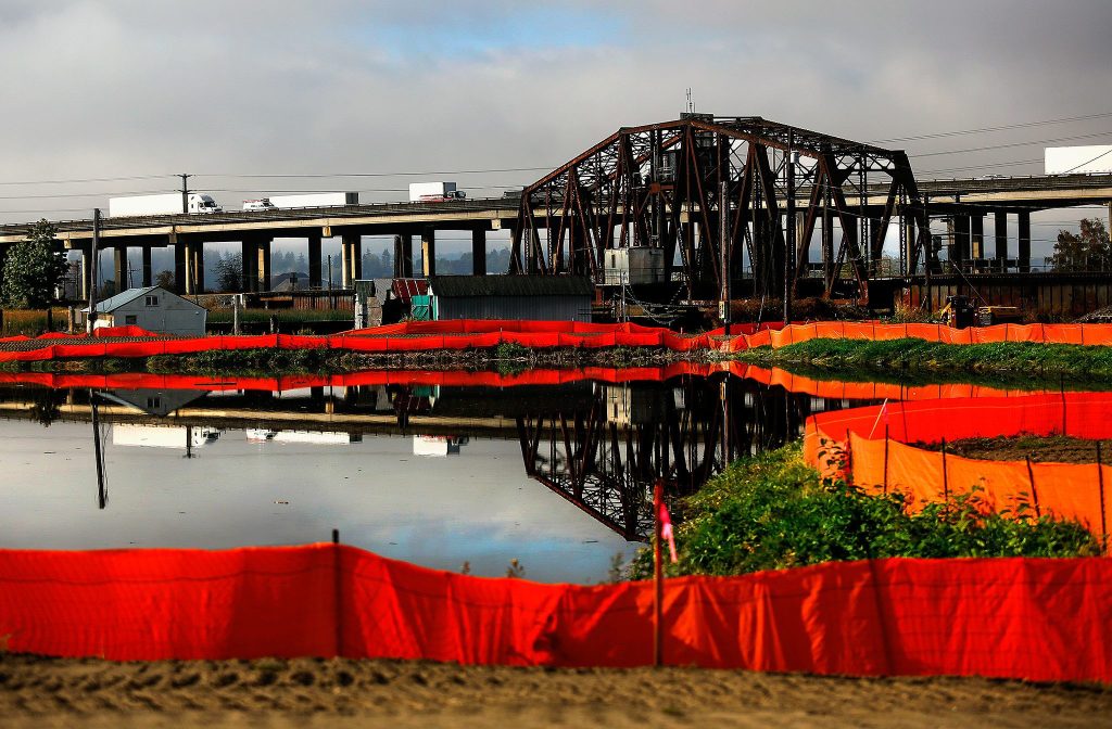 Yeah, but can they get those truck reflections out of the water? Marysville is in the process of cleaning up and converting the former Geddes Marina into a park. That involves putting down a six-inch cap of clean fill and cloth to isolate any contaminants that might be there. Later a layer of sand will be laid on the lagoon bottom for the same reason.