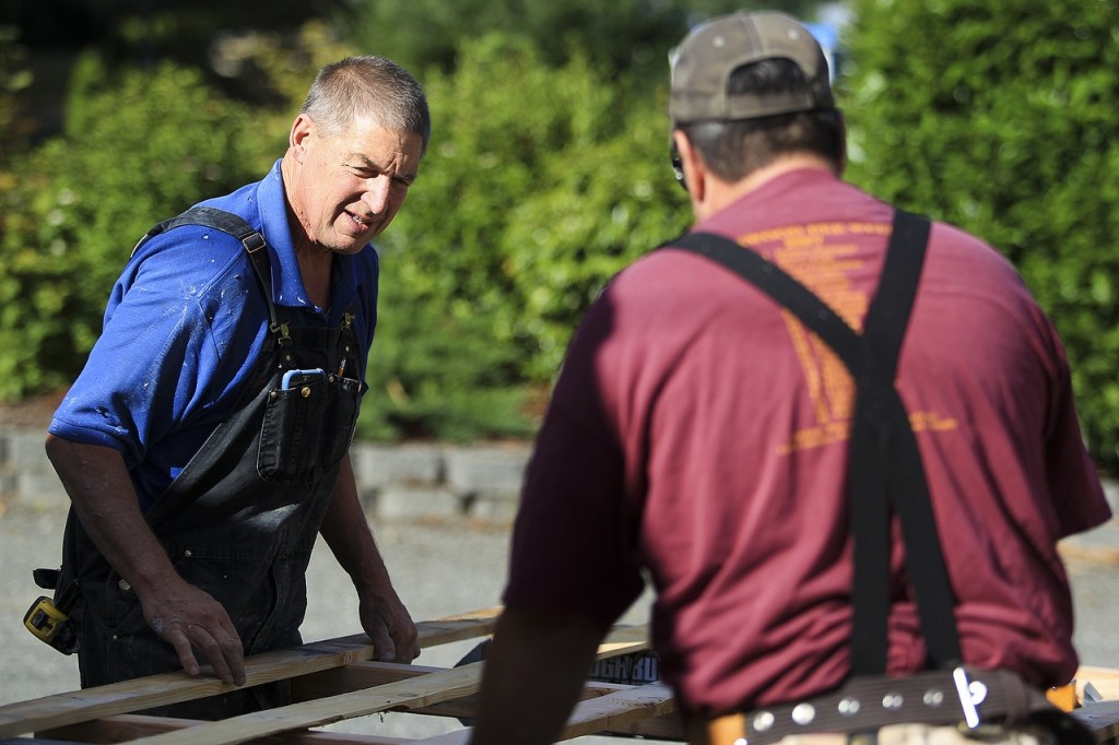 Lakewood Ward of the Church of Jesus Christ of Latter-day Saints members Russ Allen (right) and Jim Labrecque replace the siding of the The Seven Lakes Baptist Church on Saturday, Sept. 10. (Ian Terry / The Herald)
