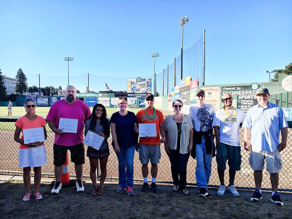 Non-profit Housing Hope honored its volunteers at a recent Everett AquaSox baseball game. Top volunteers honored included Suzie Wright of Marysville, Dwayne Carpenter of Monroe and Jaidacyn Madrigal of Everett. Also recognized were the employees of Campbell’s StockPot in Everett. In this past fiscal year, Housing Hope volunteers collectively gave 7,884 hours of time worth $228,557.