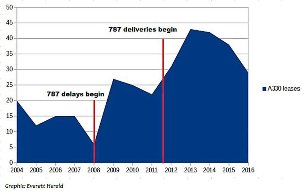 Boeing 787 delays coincided with spike in Airbus A330 leases
