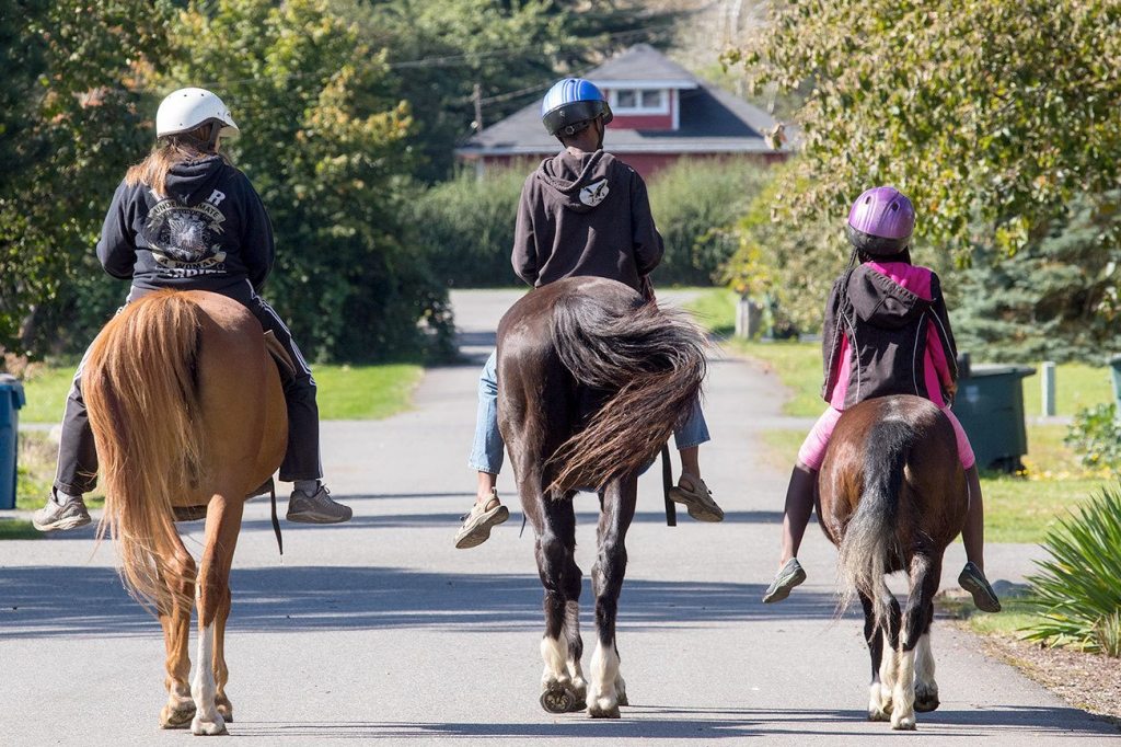 Te’onna Tobin, 12, rides her pony along with her mother, Rene Tobin, and brother, Justin, as they celebrate her birthday by riding through Startup on Tuesday.