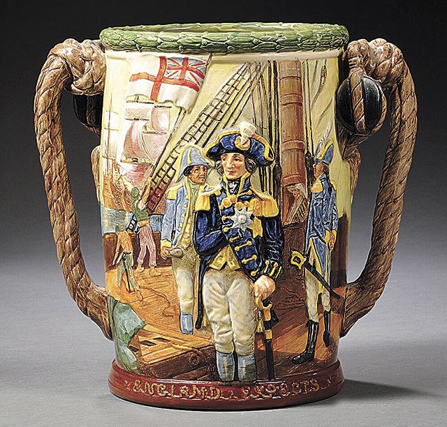 In past centuries before the invention of the camera, heroes and celebrities were remembered with figurines, prints and plates, and mugs of glass or ceramics. Coronations, royal weddings, major exhibitions, and historic events were commemorated by souvenirs with depictions of the people or the event. The Royal Doulton Co. made many figurines of attractive imaginary people and animals. The company started making several sizes of small character jugs honoring fictional as well as real people in 1930, and it still makes a few new ones each year. Most sell today for under $100. Thirty limited edition loving cups and jugs (pitchers) about 10 inches high were made from 1930 to 1938 and two that honor Queen Elizabeth, one at her coronation in 1953, the other at her Silver Jubilee in 1977. The pieces designed by Charles Noke, molded with raised figures and decorated in bright colors, are rare. Each has a special mark on the bottom explaining the history of the hero and events pictured. The standard Royal Doulton Co. mark, a lion and crown, also is used. These limited editions were selling for more than $1,000 each until about 10 years ago, when all Doulton prices fell. A commemorative Admiral Lord Nelson loving cup auctioned at Skinner Auctions in Boston in 2015 for $800. Lord Nelson was a naval hero who fought in many naval battles and seemed unstoppable. He lost an arm in one battle, an eye in another, and he was finally killed at the Battle of Trafalgar Bay in 1805. On one side of the loving cup is a picture of the one-armed Admiral in his ship; a sinking ship and lifeboat with sailors is on the other side.