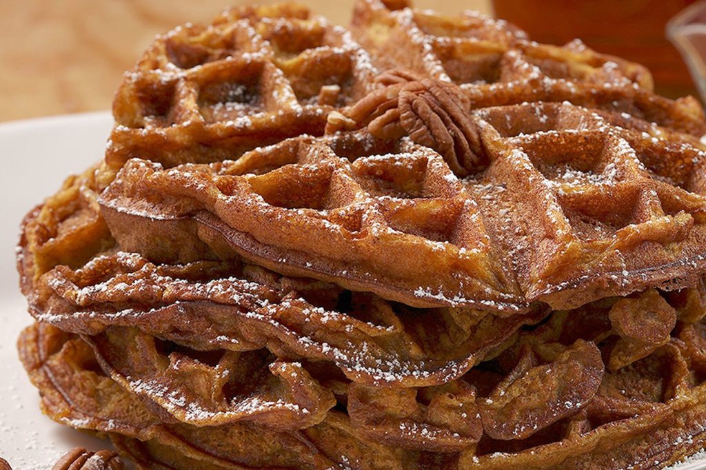 5. To serve, pile a couple of hot waffle squares on a heated serving plate. Top with a pat of butter. Sprinkle plate with pecans and pie spice. Serve with warmed syrup.