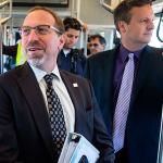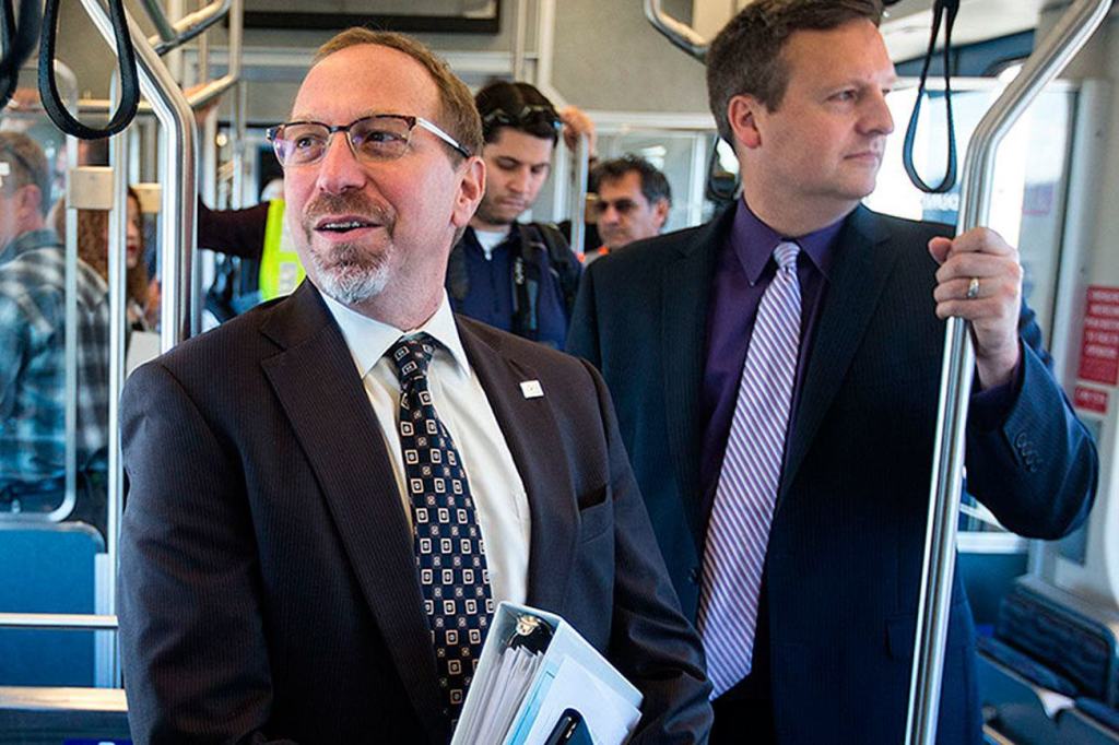 Sound Transit CEO Peter Rogoff (center) talks with King County Executive Dow Constantine while riding light rail from the new Angle Lake station south of Sea-Tac Airport.