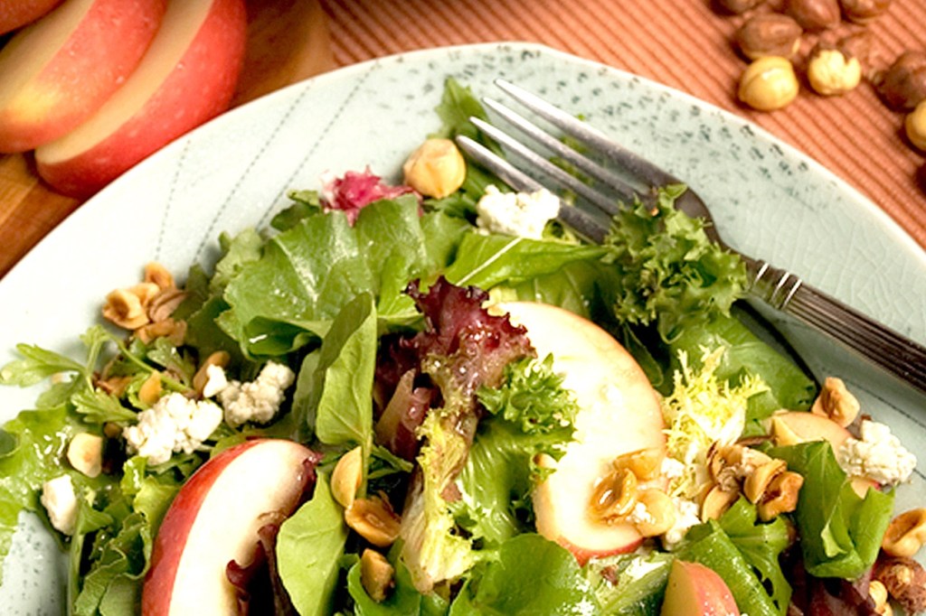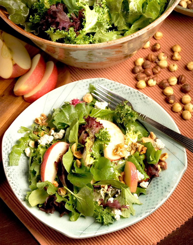 To serve: Arrange the mixed greens on individual salad plates. Divide the apple mixture among the salads. Top each serving with a portion of the cheese and then a portion of the hazelnuts. Drizzle an extra bit of the vinaigrette over the greens and around the edges of the salad. Alternatively: You could substitute feta or cheddar cheese for the blue cheese. Another serving option would be to assemble the entire salad on a large platter instead of individual salad plates.