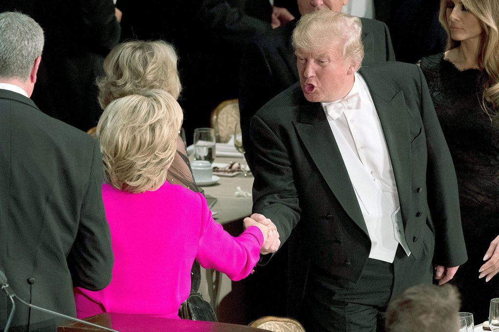 Republican presidential candidate Donald Trump (right) shakes hands with Democratic presidential candidate Hillary Clinton at the conclusion of the 71st annual Alfred E. Smith Memorial Foundation Dinner, a charity gala organized by the Archdiocese of New York, on Thursday at the Waldorf Astoria hotel. (AP Photo/Andrew Harnik)
