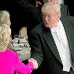 Hours after that, Trump sat on the lavish dais, decorated with pale roses and white orchids, with his arms tightly folded as the glittering elite of New York repeatedly laughed at him. The dinner’s chairman, Alfred E. Smith IV, lashed out at Trump in a series of cutting jokes. Clinton went even further, hitting all of the topics that she knows get under Trump’s skin.