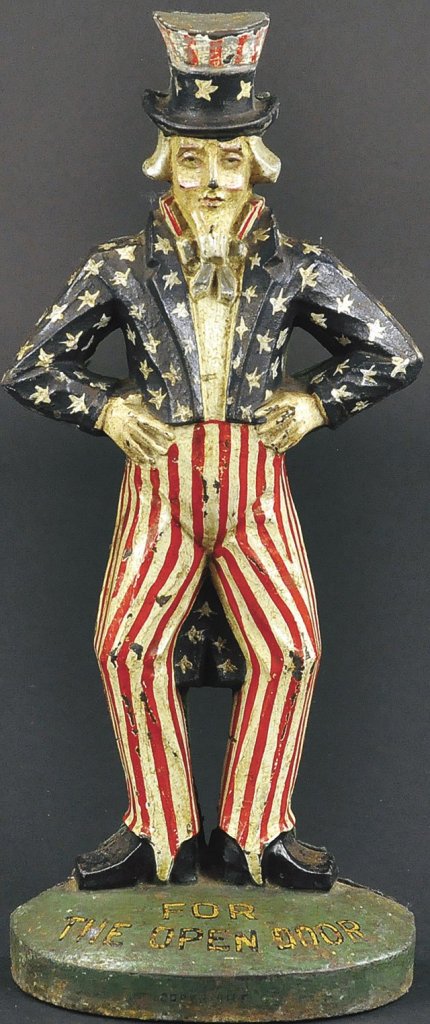 Bright new paint identifies many recent doorstops, but some, with artificial wear and tear, are good enough to fool collectors today. It is almost impossible to break an iron figure, so many iron doorstops still are available with little damage. Top prices are paid for doorstops in great condition with almost all of the original paint. And, of course, rarity adds value. This original Uncle Sam doorstop has the words “For the Open Door” on the base. The words “For the Open Door” had a political meaning, and it was not just a statement about how the doorstop was used.