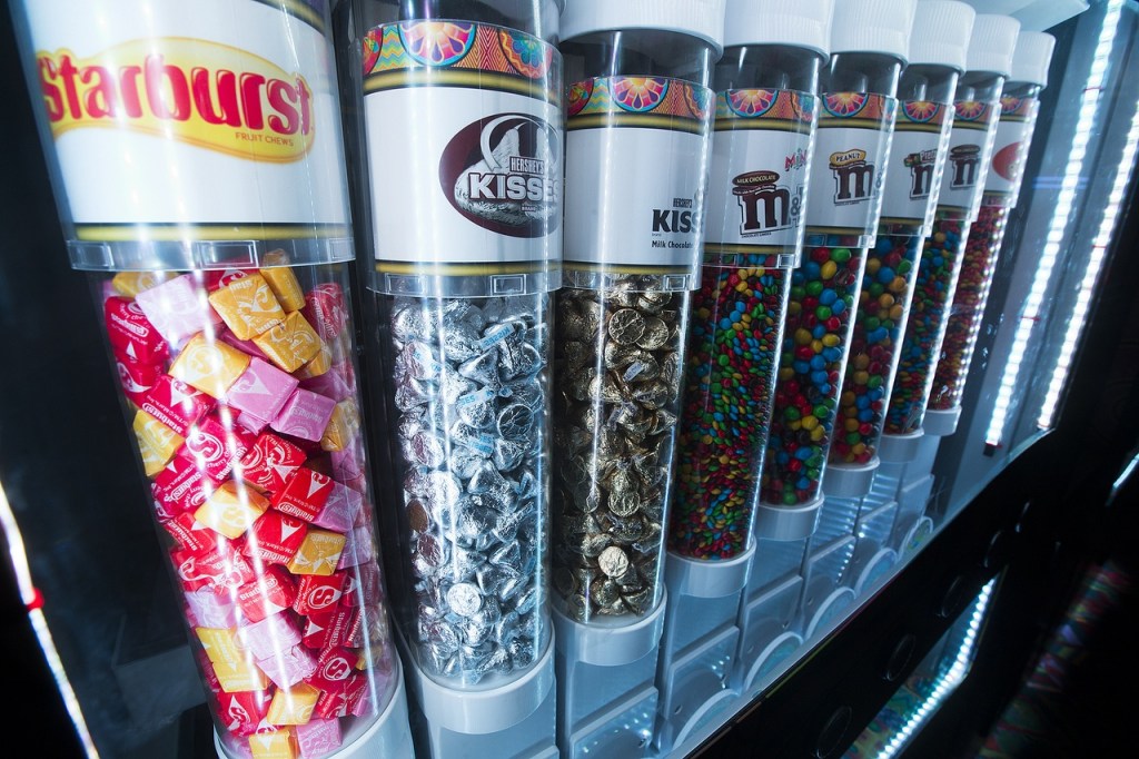 I was dazzled by a ginormous candy machine robot in the hallway. The psychedelic kiosk called Sweet Amanda’s has 16 clear plastic cylinders filled with Skittles, Reese’s Pieces, M&Ms and more. After a few taps on the touch screen and a credit card swipe, out drops a cute little to-go cup filled with heaven for $5.