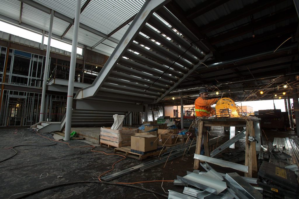 On a chilly Tuesday morning, dozens of workers framed windows, installed mechanical systems, finished stairs and built walls for the gym and theater.