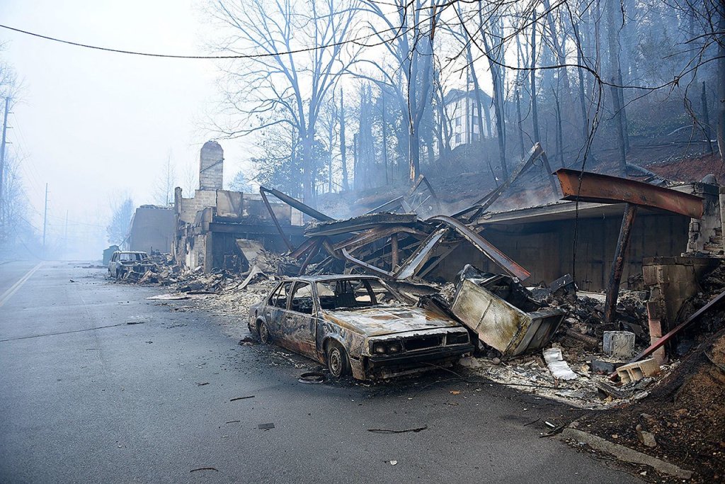 In Gatlinburg, many buildings were burned to their foundations. Hotel fire alarms echoed through empty streets lined with burned-out cars.