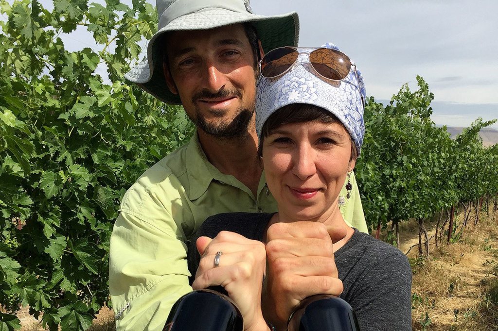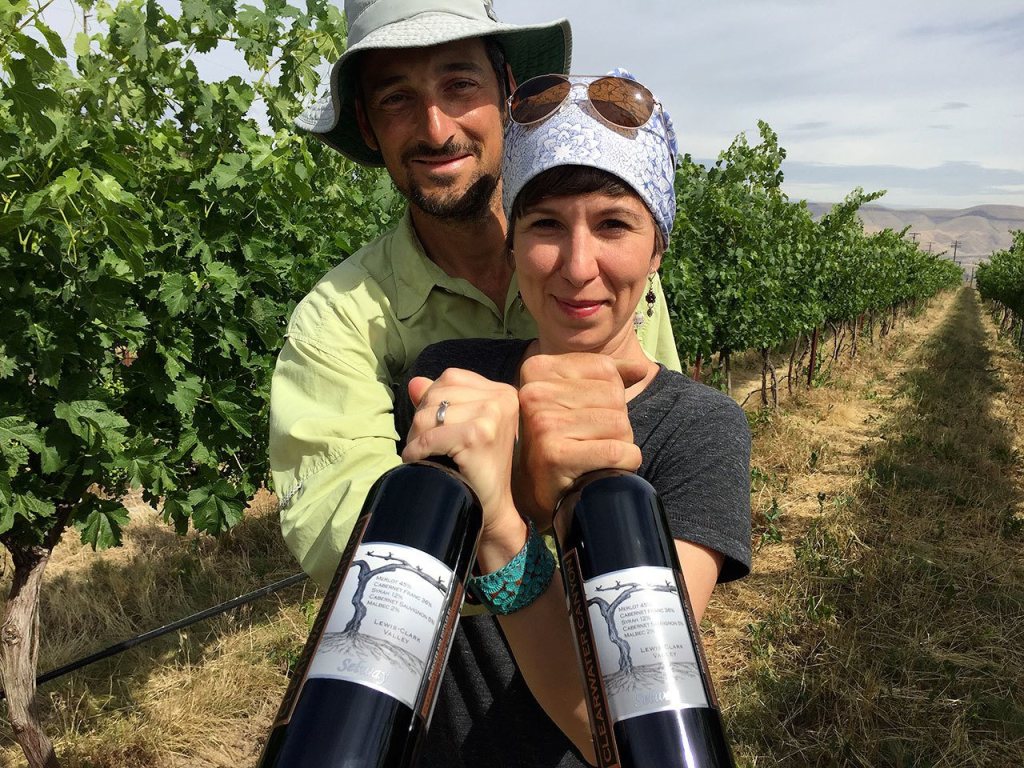 Karl and Coco Umiker stand in their Lewiston, Idaho, vineyard holding bottles of Clearwater Canyon Cellars 2013 Selway Red Wine, which won a double gold at the 2016 San Francisco International Wine Competition. (Photo by Eric Degerman/Great Northwest Wine)