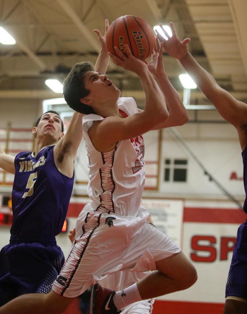 Stanwood’s Nate Kummer is fouled as he goes up for a shot during a game against Lake Stevens on Tuesday in Stanwood. The Spartans won 74-51. (Andy Bronson / The Herald)