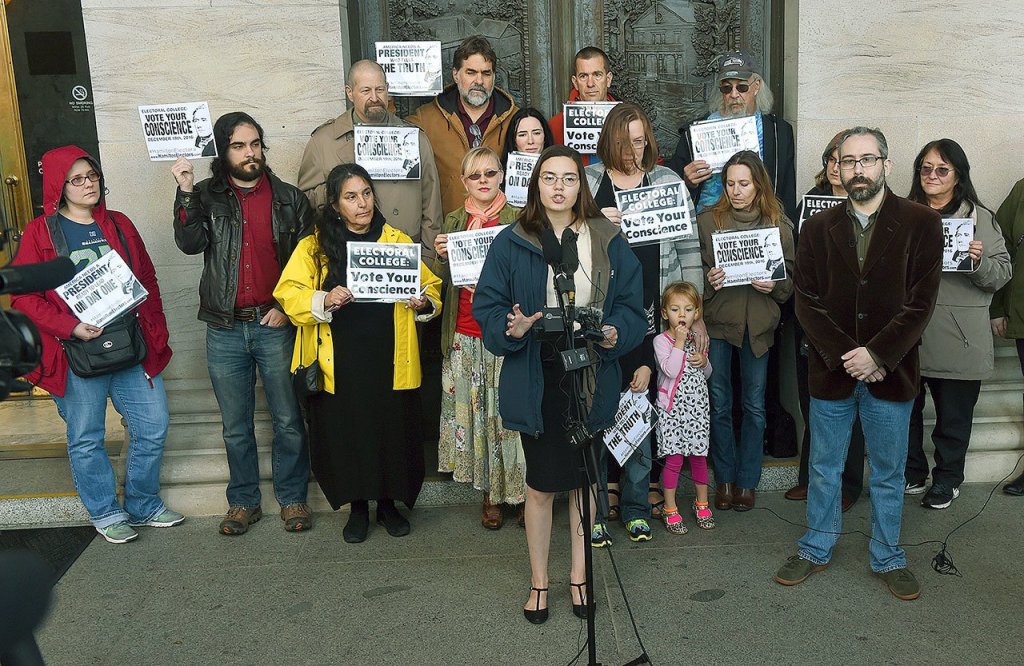 During a news conference in Olympia on Nov. 30, Washington presidential elector Levi Guerra (center) is joined by elector Bret Chiafalo of Everett (second from right) as they announce that they’re asking members of the Electoral College to pick a Republican “consensus candidate” rather than Donald Trump. (Steve Bloom / The Olympian via AP)