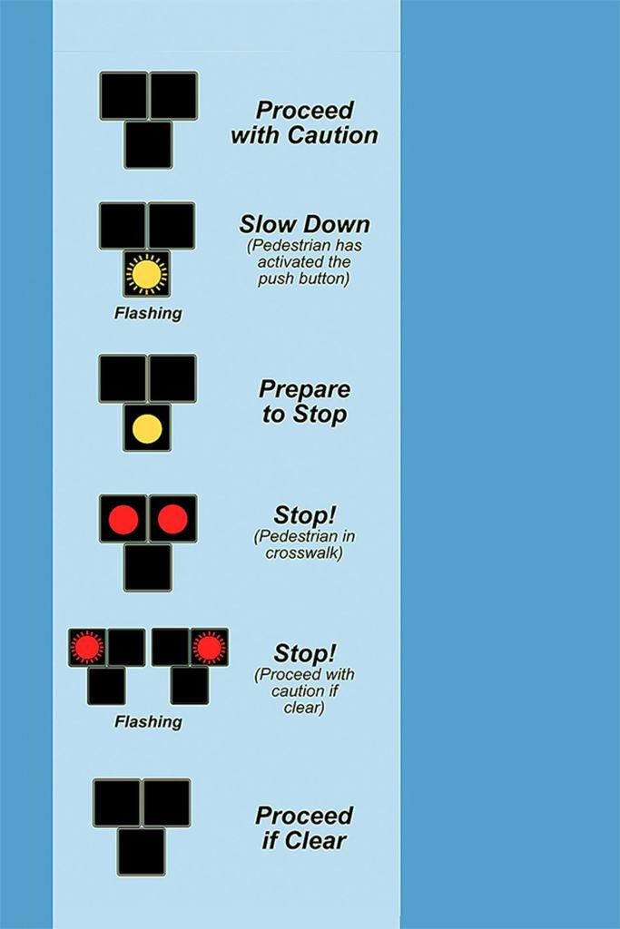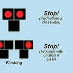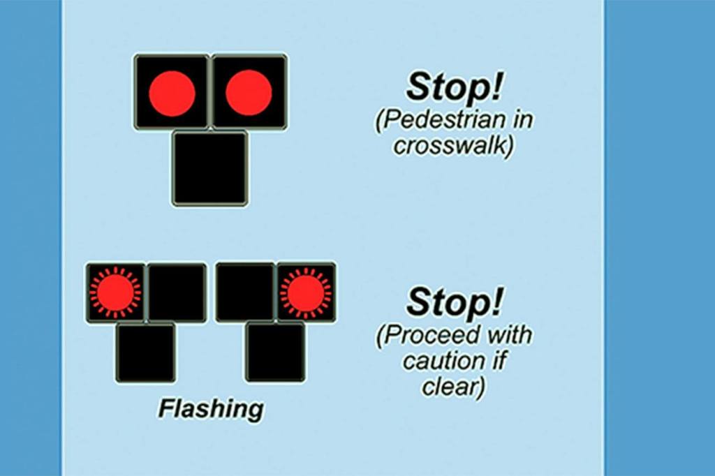 Flashing red: Drivers may proceed one at a time if crosswalk is clear of pedestrians.